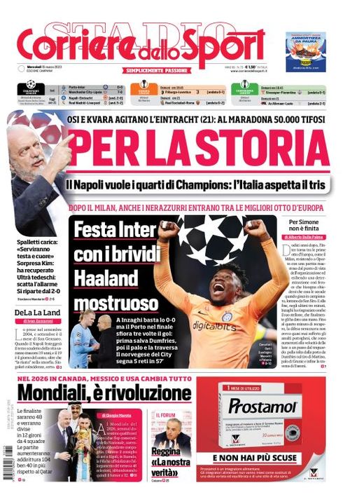 Il Corriere dello Sport, nella sua edizione Campania di oggi, apre in prima pagina con la sfida degli ottavi di Champions League tra Napoli ed Eintracht Francoforte: "Per la storia. Il Napoli vuole i quarti di Champions: l'Italia aspetta il tris. Osi e Kvara agitano l'Eintracht (21): al Maradona 50.000 tifosi". Di spalla: "Spalletti carica: 'Serviranno testa e cuore'. Sorpresa Kim: ha recuperato. Ultrà tedeschi: scatta l'allarme. Si riparte dal 2-0".