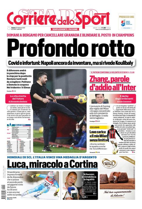 Il Corriere dello Sport, nella sua edizione Campania di oggi, apre in prima pagina con la crisi del Napoli e la posizione di Rino Gattuso all'indomani della sfida con l'Atalanta: "Profondo rotto. Covid e infortuni: Napoli ancora da inventare, ma si rivede Koulibaly". Sulla destra si parla dell'Inter e della situazione finanziaria in casa nerazzurra: "Zhang, parole d'addio all'Inter". In taglio basso spazio ai mondiali di sci con la vittoria della medaglia d'argento dell'Italia: "Luca, miracolo a Cortina".