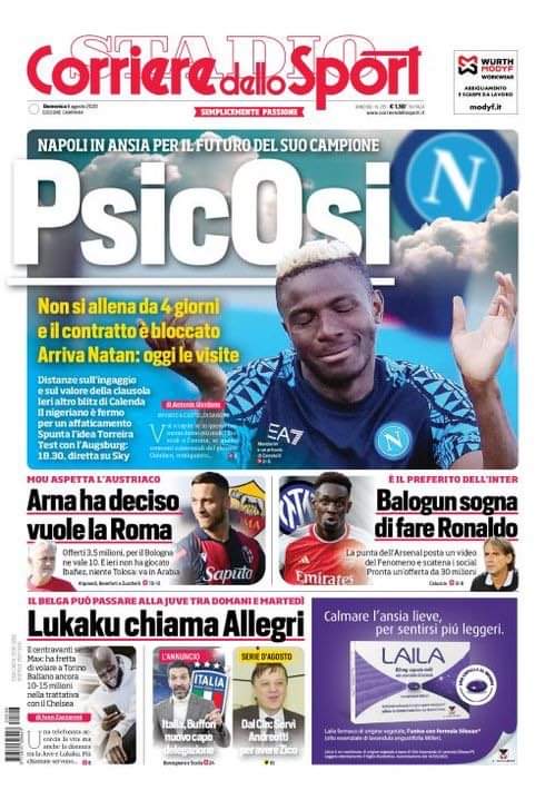 Il Corriere dello Sport, nella sua edizione Campania di oggi, dedica l'apertura in prima pagina a Osimhen, ancora fermo ai box e senza rinnovo: "PsicOsi. Non si allena da 4 giorni e il contratto è bloccato. Distanze sull'ingaggio e sul valore della clausola: Ieri altro blitz di Calenda". Spazio anche al mercato azzurro: "Arriva Natan, oggi le visite. Spunta l'idea Torreira".