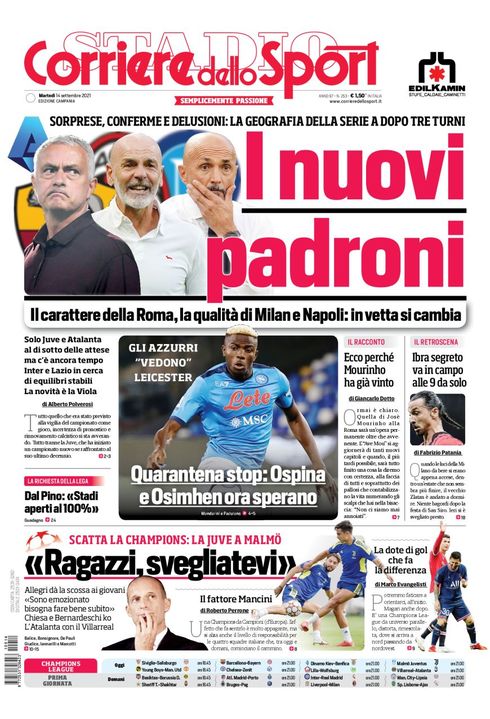 Il Corriere dello Sport, nella sua edizione Campania di oggi, apre in prima pagina con il Napoli che tra due giorni debutterà in Europa League ed è in attesa della deroga ufficiale del governo inglese all'Uefa: "Gli azzurri vedono Leicester. Quarantena stop: Ospina e Osimhen ora sperano". In taglio alto spazio anche alle tre squadre a punteggio pieno in Serie A: "I nuovi padroni. Il carattere della Roma, la qualità di Milan e Napoli: in vetta si cambia. Solo Juve e Atalanta al di sotto delle attese ma c'è ancora tempo. Inter e Lazio in cerca di equilibri stabili. La novità è la Viola". In basso l'impegno europeo della Juventus e le parole di Max Allegri.