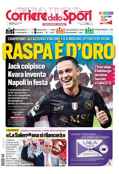 Il Corriere dello Sport, nella sua edizione Campania di oggi, apre in prima pagina con la vittoria del Napoli a Berlino contro l'Union: "Raspa è d'oro. Jack colpisce, Kvara inventa: Napoli in festa. L'attaccante sblocca al 65' una partita che si era complicata sfruttando l'assist del georgiano. Garcia: la rabbia giusta".