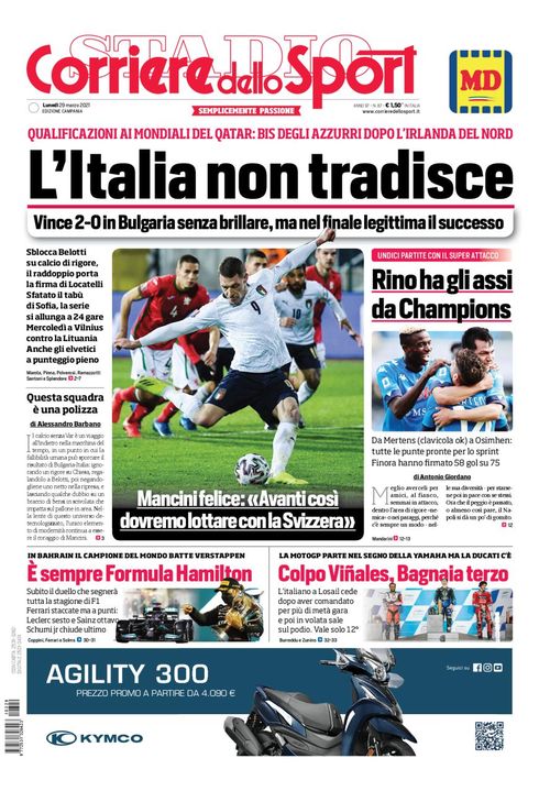Il Corriere dello Sport, nella sua edizione Campania di oggi, titola in prima pagina: "Rino ha gli assi da Champions. Da Mertens (clavicola ok) a Osimhen: tutte le punte pronte per lo sprint. Finora hanno firmato 58 gol su 75". In basso spazio alle prime gare dei Mondiali di Formula 1 e Moto Gp: "E' sempre Formula Hamilton. Colpo Viñales, Bagnaia terzo".
