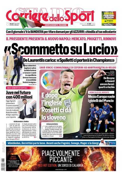 Il Corriere dello Sport, nell'edizione Campania di oggi, apre in prima pagina con le dichiarazioni di ADL in confernza stampa: "Scommetto su Lucio. Spalletti ci porterà in Champions. Ormai nessuno è incedibile. Vedrò Insigne". A centro pagina spazio alle designazioni arbitrali per i quarti di Euro 2020: "E dopo l'inglese Rosetti ci dà lo sloveno. Sarà Vincic (connazionle di Ceferin) ad arbitrare Italia-Belgio".