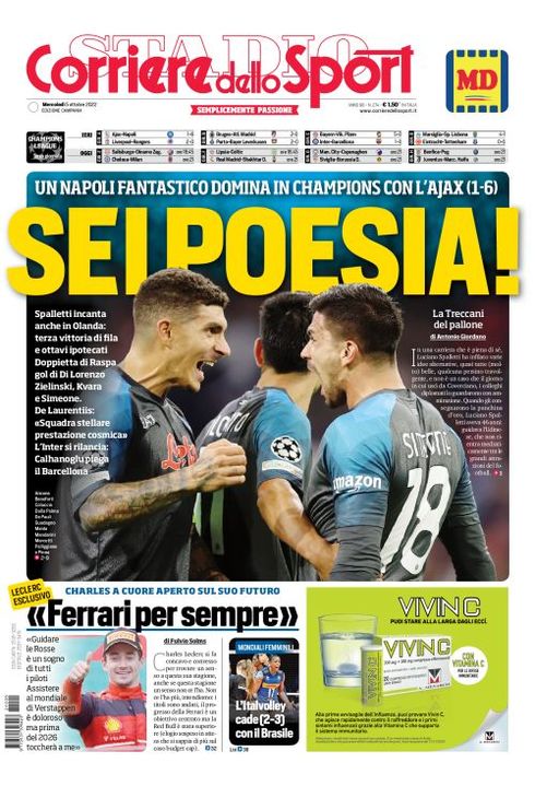 Il Corriere dello Sport, nella sua edizione Campania di oggi, dedica la prima pagina alla goleada del Napoli ad Amsterdam contro l'Ajax: "Sei poesia! Un Napoli fantastico domina in Champions con l'Ajax (1-6). Spalletti incanta anche in Olanda: terza vittoria consecutiva e ottavi ipotecati. Doppietta di Raspa, gol di Di Lorenzo, Zielinski, Kvara e Simeone. De Laurentiis: 'Squadra stellare, prestazione cosmica'".