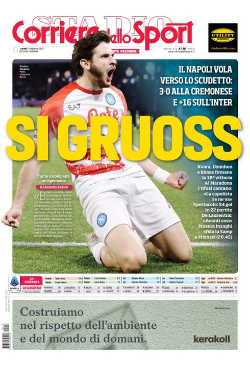 Il Corriere dello Sport, nella sua edizione Campania di oggi, apre in prima pagina con la vittoria del Napoli contro la Cremonese: "Si gruoss. Il Napoli vola verso lo scudetto: 3-0 alla Cremonese e +16 sull'Inter. Kvara, Osimhen e Elmas firmano la 18ª vittoria. Al Maradona i tifosi cantano: 'La capolista se ne va'. Spettacolo: 54 gol in 22 partite. De Laurentiis: 'Avanti così'. Stasera Inzaghi sfida la Samp a Marassi (20.45)".