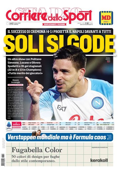 Il Corriere dello Sport, nella sua edizione Campania di oggi, apre in prima pagina, con la vittoria del Napoli a Cremona che vale il primo posto in solitaria per gli azzurri: "Soli si gode. Un altro show con Politano, Simeone, Lozano e Olivera. Spalletti a 35 gol stagionali (22 in Serie A e 13 in Champions). 'Tutto merito dei giocatori'. Il successo di Cremona (1-4) proietta il Napoli davanti a tutti".