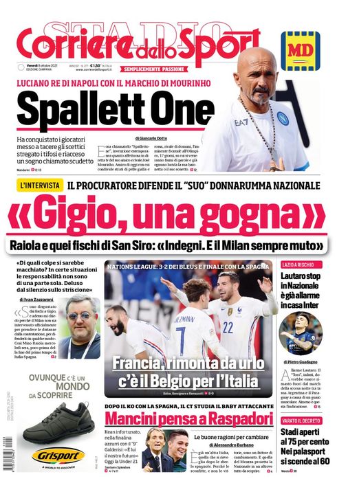 Il Corriere dello Sport, nella sua edizione Campania di oggi, apre in prima pagina con un focus sull'allenatore del Napoli Luciano Spalletti: "SpallettOne. Luciano re di Napoli con il marchio di Mourinho. Ha conquistato i giocatori, messo a tacere gli scettici, stregato i tifosi e riacceso un sogno chiamato scudetto". Sulla destra l'allarme Lautaro Martinez in casa Inter. Al centro l'intervista esclusiva a Mino Raiola che difende il suo assistito Donnarumma dalle critiche: "Gigio, una gogna". In basso la Nazionale con Mancini che pensa a Raspadori, mentre al centro il successo in rimonta della Francia in Nations League: "Francia, rimonta da Urlo: c'è il Belgio per l'Italia".