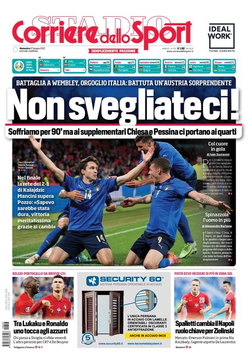 “Spalletti cambia il Napoli: ruolo chiave per Zielinski. Piotr deve incidere di più in zona gol". Il Corriere dello Sport, nella sua edizione Campania di oggi, apre in prima pagina con il nuovo Napoli di Spalletti e sulla posizione di Piotr Zielinski. Spazio anche al mercato azzurro: "Emerson Palmieri in prima fila. Koulibaly, l'agente aspetta De Laurentiis". Al centro il successo dell'Italia sull'Austria. La squadra di Mancini vola così ai quarti di finale di Euro2020: "Non svegliateci".