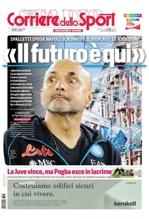 Il Corriere dello Sport, nella sua edizione Campania di oggi, dedica la prima pagina alle parole di Luciano Spalletti dopo la sconfitta di Monza: "Spalletti: 'Il futuro è qui'. Spalletti sposa Napoli: il rinnovo, il mercato, le ambizioni. 'Questa società sa programmare, l'anno scorso è stata brava a trovare in corsa soluzioni di livello. E anche adesso sta seguendo diversi giocatori'".