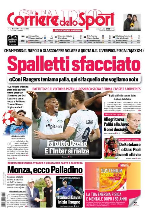 Il Corriere dello Sport, nella sua edizione Campania di oggi, apre in prima pagina con le parole di Spalletti in vista della sfida di oggi contro i Rangers: "Spalletti sfacciato. 'Con i Rangers teniamo la palla, qui si fa quello che vogliamo noi. La nostra crescita passa da partite come questa'. Simeone per Osi, Lozano a casa: tocca a Politano. Torna Olivera. Si gioca alle 21".