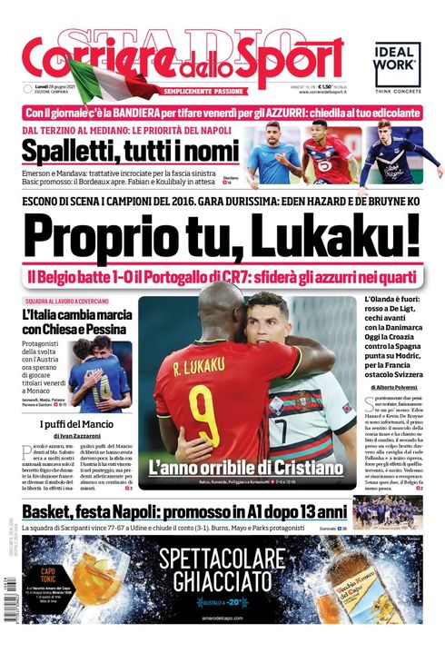 Il Corriere dello Sport, nella sua edizione Campania di oggi, apre in prima pagina con tutte le trattative di mercato del Napoli: "Spalletti, tutti i nomi. Dal terzino al mediano: le priorità del Napoli. Emerson e Mandava: trattative incrociate per la fascia sinistra. Basic promosso: il Bordeaux apre. Fabian e Koulibaly in attesa". A centro pagina spazio a CR7, eliminato col suo Portogallo dal Belgio di Lukaku: "L'anno orribile di Cristiano".