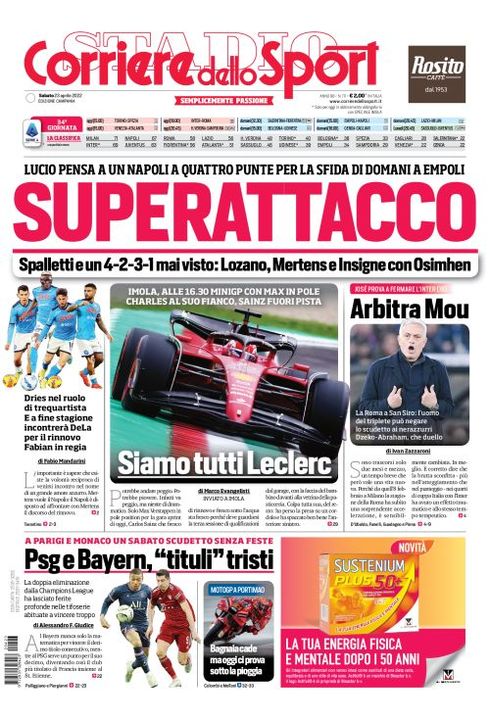 Il Corriere dello Sport, nella sua edizione Campania di oggi, apre in prima pagina con un'ipotetico schieramento del Napoli nella sfida di domani con l'Empoli: "Superattacco. Spalletti e un 4-2-3-1 mai visto: Lozano, Mertens e Insigne con Osimhen. Dries nel ruolo di trequartista e a fine stagione incontrerà ADL per il rinnovo. Fabian in regia". In taglio basso spazio a Psg e Bayern Monaco ad un passo dal titolo: "Psg e Bayer: 'tituli' tristi".