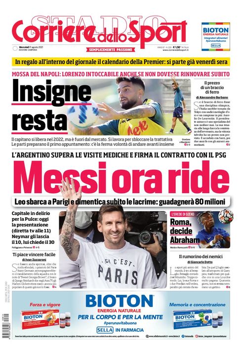 Il Corriere dello Sport, nella sua edizione Campania di oggi, apre in prima pagina con il futuro del capitano del Napoli: “Insigne resta. Mossa del Napoli: Lorenzo intoccabile anche se non dovesse rinnovare subito. Il capitano si libera nel 2022, ma è fuori dal mercato. Si lavora per sbloccare la trattativa. Le parti preparano il primo appuntamento: c'è la ferma volontà di andare avanti insieme". Al centro Lionel Messi al PSG: "Messi ora ride. Leo sbarca a Parigi e dimentica le lacrime: guadagnerà 80 milioni".