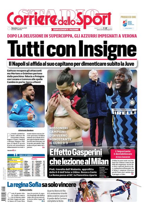 Il Corriere dello Sport nella sua edizione Campania apre oggi in prima pagina con gli azzurri impegnati nella trasferta di Verona: "Il Napoli si affida al suo capitano per dimenticare subito la Juve. Gattuso recupera gli attaccanti, ma Mertens e Osimhen partono dalla panchina: fiducia a Petagna con Lozano e Lorenzo alle spalle. Cambio in porta: tocca a Meret".