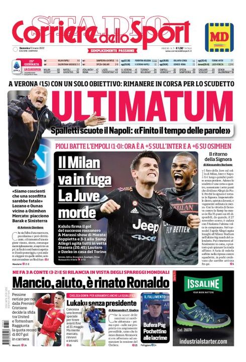 Il Corriere dello Sport, nella sua edizione Campania di oggi, apre in prima pagina con la sfida che attende il Napoli a Verona: "Ultimatum. A Verona con un solo obiettivo: rimanere in corsa per lo scudetto. Spalletti scuote il Napoli: 'Finito il tempo delle parole. Siamo coscienti che una sconfitta sarebbe fatale'". Le scelte del tecnico azzurro per la gara del Bentegodi: "Lozano e Ounas vicino a Osimhen". Intanto il Napoli lavora sul prossimo mercato: "Piacciono Barak e Sinisterra".