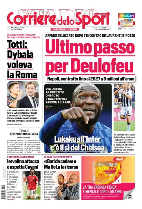 Il Corriere dello Sport, nella sua edizione Campania di oggi, apre in prima pagina con la trattativa tra Napoli e Udinese per Deulofeu: "Ultimo passo per Deulofeu. Affare sbloccato dopo l'incontro De Laurentiis-Pozzo. Napoli, contratto fino al 2027 a 3 milioni all'anno. All'Udinese un assegno da 18 milioni più bonus". In taglio basso spazio alle dichiarazione del presidente della Salernitana: "Iervolino attacca e aspetta Cavani".