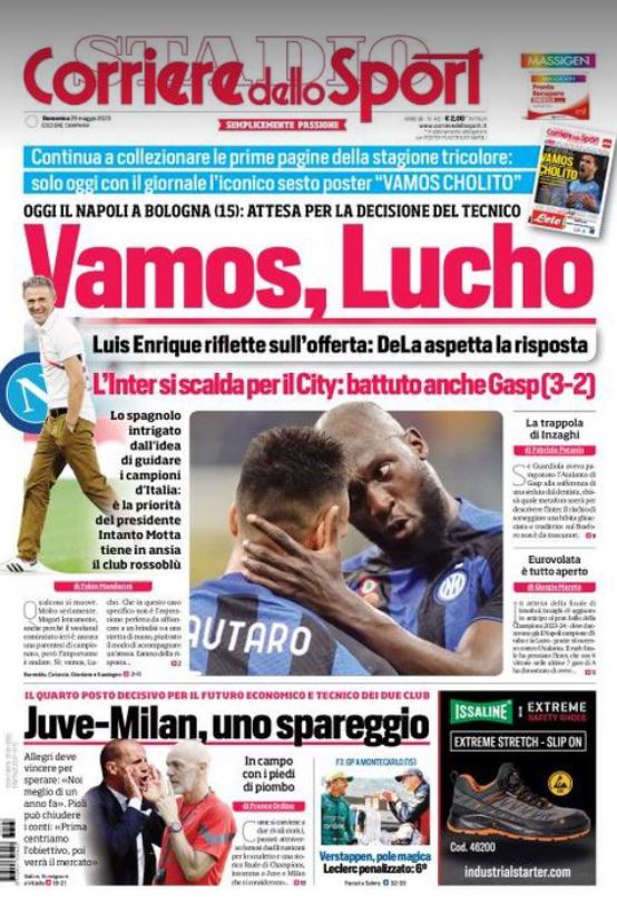 "Vamos, Lucho". E' questo il titolo d'apertura dell'edizione odierna del Corriere dello Sport. Luis Enrique - si legge - riflette sull'offerta del Napoli, che attende una risposta da parte dell'allenatore spagnolo. Gli azzurri intanto oggi saranno impegnati a Bologna.