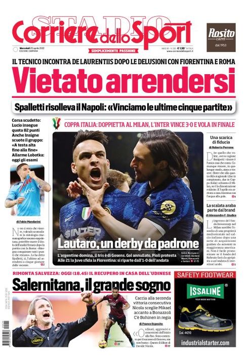 Il Corriere dello Sport, nella sua edizione Campania di oggi, apre in prima pagina con l'incontro tra Spalletti e De Laurentiis dopo il pareggio con la Roma: "Vietato arrendersi. Spalletti risolleva il Napoli: 'Vinciamo le ultime cinque partite'. Luciano insegue 82 punti. Anche Insigne scuote il gruppo: 'A testa alta fino alla fine'. Allarme Lobotka: oggi gli esami". In taglio basso spazio alla Salernitana, in campo oggi nel recupero di Udine: "Salernitana, il grande sogno".
