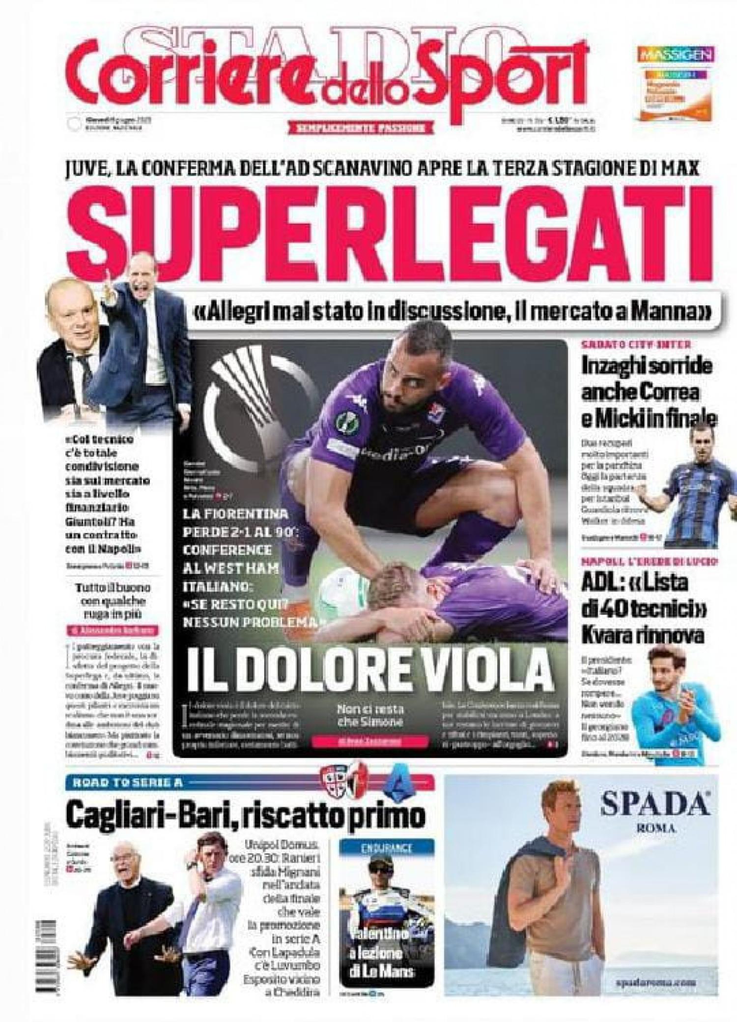 Nell'edizione di oggi, il Corriere dello Sport apre in prima pagina con la conferma di Allegri sulla panchina della Juventus: "Superlegati. Juve, la conferma dell'ad Scanavino apre la terza stagione di Max". A centro pagina spazio alla sconfitta della Fiorentina in finale di Conference League: "Il dolore viola". Di spalla spazio alle parole di ADL: "Lista di 40 tecnici" e al mercato azzurro: "Kvara rinnova".