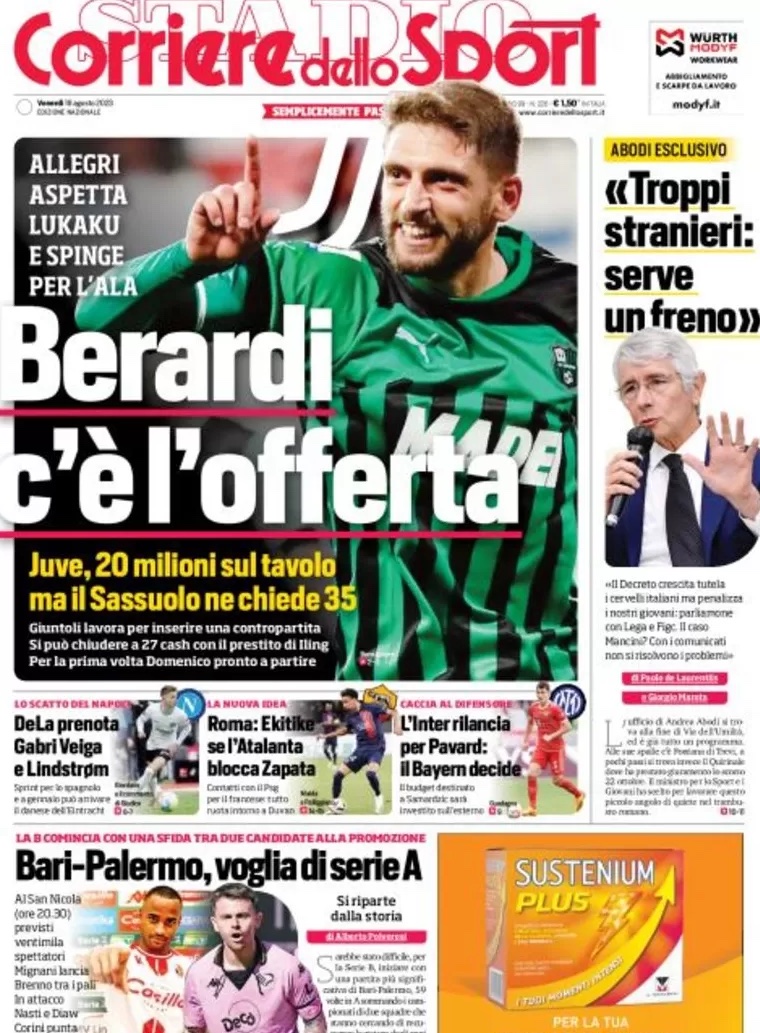 "ADL prenota Gabri Veiga e Lindstrom", titola in prima pagina il Corriere dello Sport raccontando che siamo allo sprint per lo spagnolo e si punta anche al talento dell'Eintracht. L'apertura è della Juventus con l'offerta per Berardi anche se c'è distanza tra le parti.