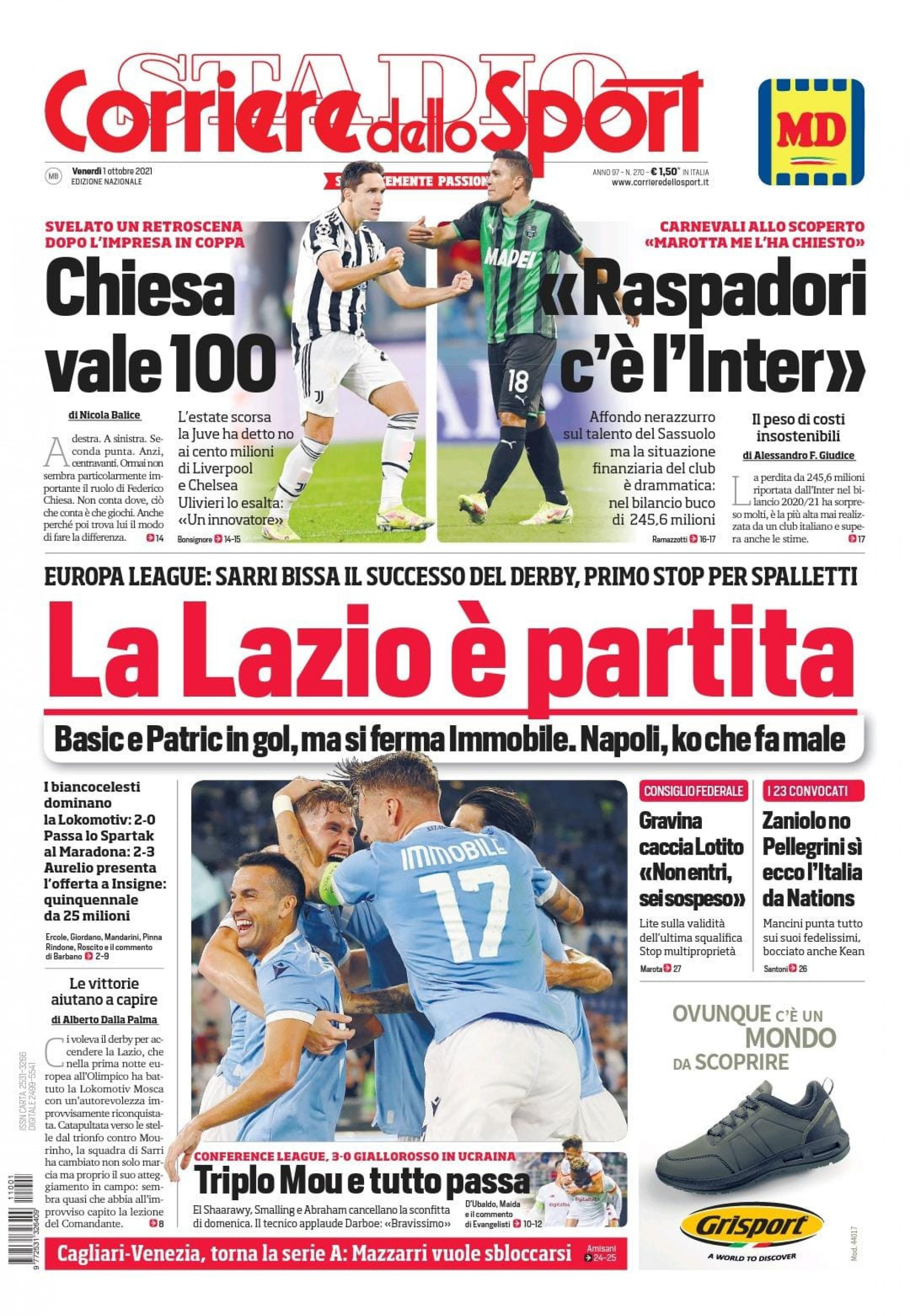 Il Corriere dello Sport apre in prima pagina con la sconfitta europea del Napoli di Spalletti contro lo Spartak Mosca: “Napoli, ko che fa male. Passa lo Spartak al Maradona: 2-3. Aurelio prepara l'offerta a Insigne: quinquennale da 25 milioni". Spazio anche alla vittoria della Lazio: "La Lazio è partita. Basic e Patric in gol, ma si ferma Immobile". In taglio alto Juve e Inter: "Chiesa vale 100. Raspadori, c'è l'Inter". In basso la Roma: "Triplo Mou e tutto passa".