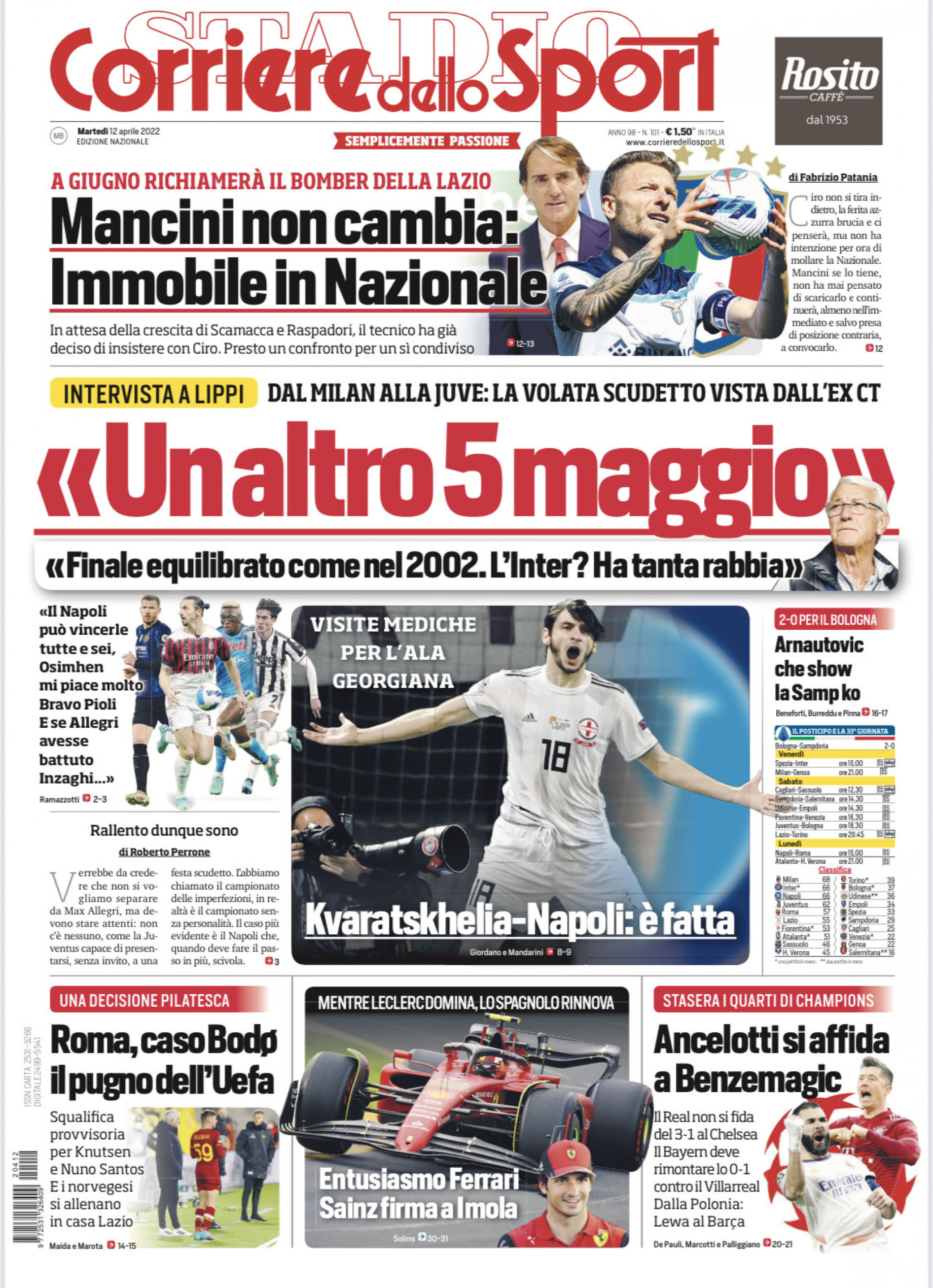 Il Corriere dello Sport apre in prima pagina con il prossimo acquisto del Napoli: “Kvaratskhelia-Napoli: è fatta. Visite mediche per l'ala georgiana". In taglio alto le parole di Marcello Lippi sulla lotta scudetto. Spazio anche agli azzurri: "Mancini non cambia: Immobile in Nazionale". Di spalla spazio alla Serie A: "Arnautovic che show, Samp ko". In basso c'è la Conference League: "Roma, caso Bodo. Il pugno della Uefa". Spazio anche alla Champions: "Ancelotti si affida a Benzemagic".