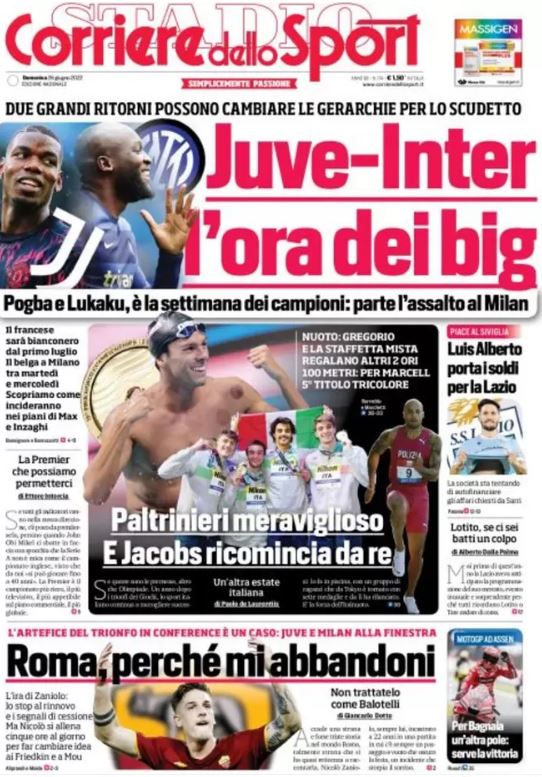 "Juve-Inter, l'ora dei big". E' questo il titolo d'apertura dell'edizione odierna del Corriere dello Sport: "Due grandi ritorni possono cambiare le gerarchie per lo Scudetto", si legge ancora. Quella che sta per cominciare è la settimana dei ritorni dei due ex: Pogba alla Juve, Lukaku all'Inter.