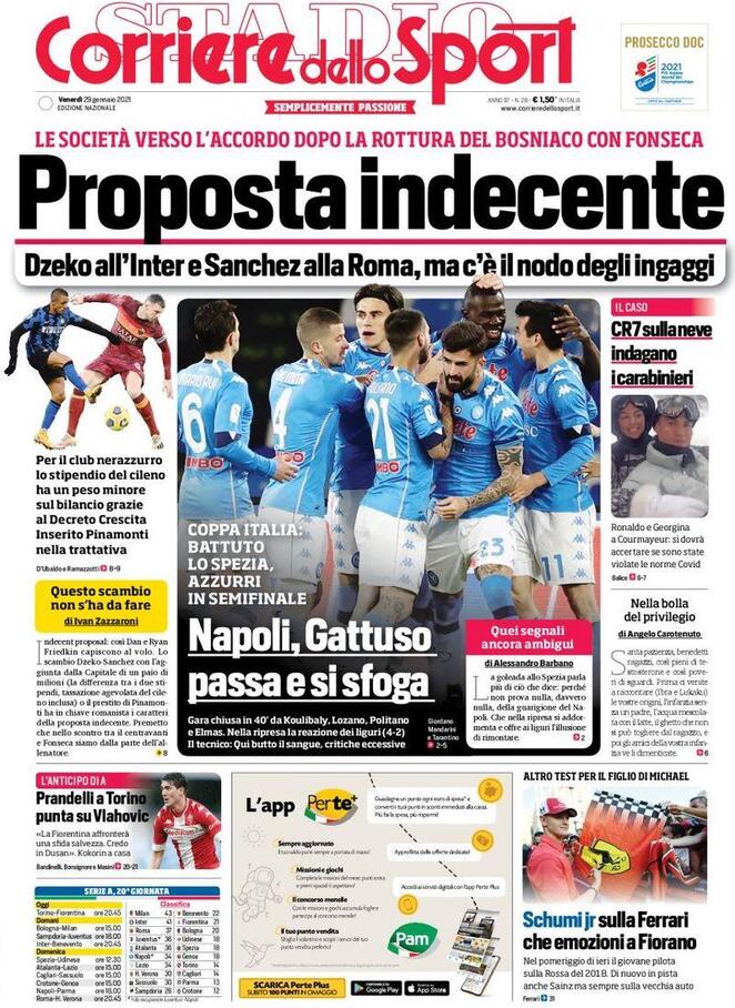 "Napoli, Gattuso passa e si sfoga". E' questo il titolo d'apertura dell'edizione odierna del Corriere dello Sport all'indomani del successo azzurro contro lo Spezia e la semifinale di Coppa Italia conquistata. Sulla formazione e il momento di Rino Gattuso si sofferma anche Alessandro Barbano con un editoriale: "Quei segnali ancora ambigui".