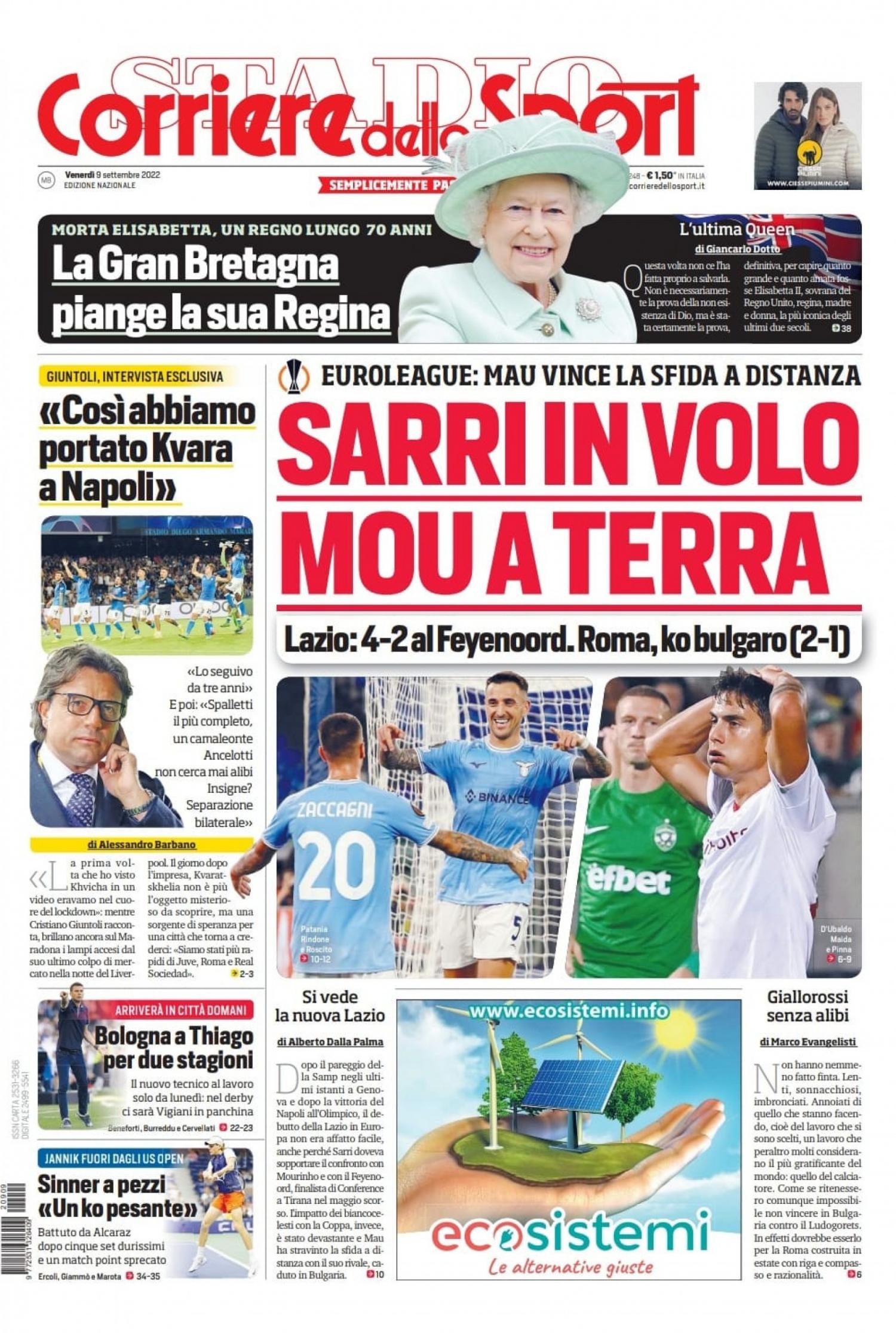 “Così abbiamo portato Kvara a Napoli”. Il Corriere dello Sport apre in prima pagina con l’intervista a Cristiano Giuntoli. “Lo seguivo da tre anni”. E poi: ‘Spalletti il più completo, un camaleonte. Ancelotti non cerca mai alibi. Insigne? Separazione bilaterale’”. Al centro spazio alla bella vittoria della Lazio in Europa League e alla sconfitta della Roma: "Sarri in volo, Mou a terra". In basso spazio al nuovo allenatore del Bologna: "Bologna a Thiago per due stagioni". In alto uno spazio riservato alla morte della Regina Elisabetta.