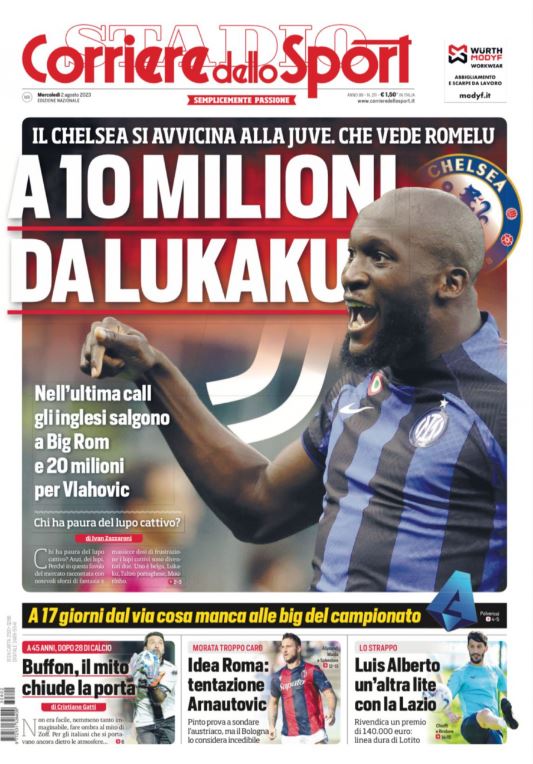 "A 10 milioni da Lukaku". E' questo il titolo d'apertura dell'edizione odierna del Corriere dello Sport: "Il Chelsea si avvicina alla Juve, che vede Romelu. Nell'ultima call gli inglesi salgono a Big Rom e 20 milioni per Vlahovic". Spazio anche alla Lazio: "Luis Alberto, un'altra lite con la Lazio".