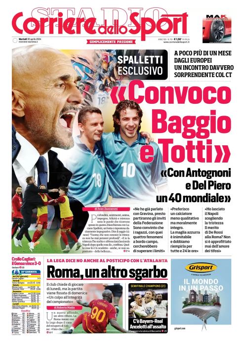Nell'edizione odierna, Il Corriere dello Sport apre con l'intervista esclusiva a Spalletti: "Convoco Baggio e Totti". Prosegue: "Con Antognoni e Del Piero un 40 mondiale... Sono convinto che i ragazzi, con quei quattro fenomeni a bordo campo, cercherebbero di superare i limiti". In taglio basso un box è riservato ai giallorossi: "Roma, un altro sgarbo". Il sommario: "La Lega dice no anche al posticipo con l'Atalanta".