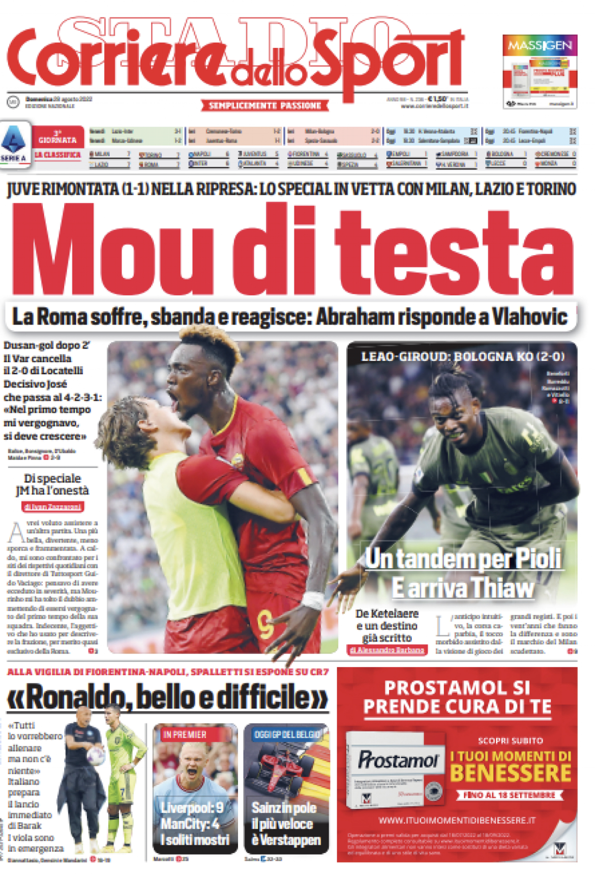 Il Corriere dello Sport apre in prima pagina con le parole di Luciano Spalletti su CR7: “'Ronaldo, bello e difficile'. Alla vigilia di Fiorentina-Napoli, Spalletti si espone su CR7. 'Tutti lo vorrebbero allenare ma non c'è niente'. Italiano prepara il lancio immediato di Barak. I viola sono in emergenza". Al centro ampio spazio al pareggio della Roma contro la Juventus. Spazio anche per la vittoria del Milan e l'arrivo di Thiaw in rossonero.