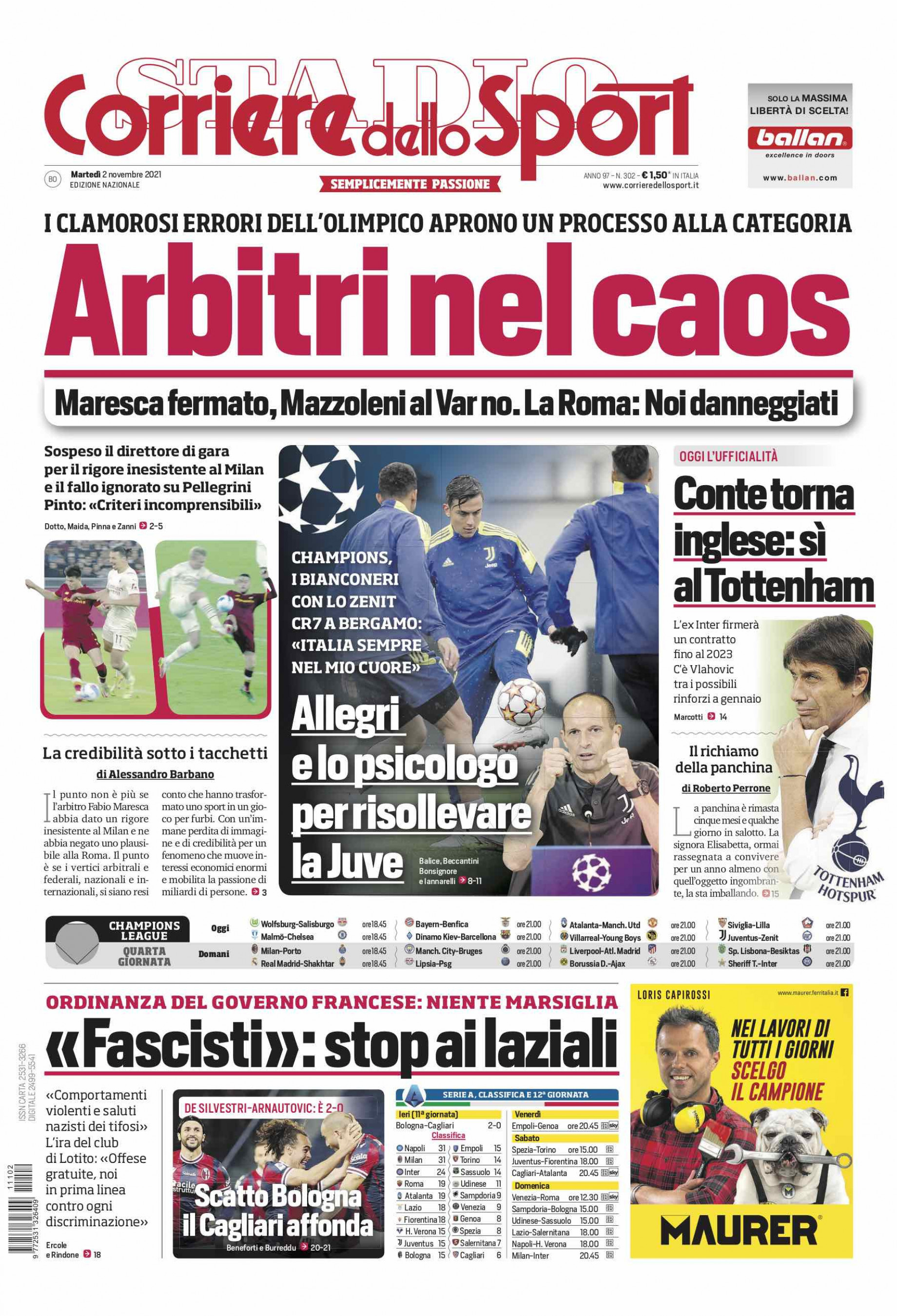 Il Corriere dello Sport apre in prima pagina con i casi arbitrali avvenuti in Roma-Milan e le conseguenti polemiche rivolte all’arbitro Maresca: "Arbitri nel caos. I clamorosi errori dell’Olimpico aprono un processo alla categoria. Maresca fermato, Mazzoleni al Var no. La Roma: noi danneggiati. Sospeso il direttore di gara per il rigore inesistente al Milan e il fallo ignorato su Pellegrini”. Al centro si parla della Juventus: “Allegri e lo psicologo per risollevare la Juve”. Sulla destra Antonio Conte che torna in Premier, mentre in basso il Marsiglia che vieta la trasferata ai tifosi laziali.