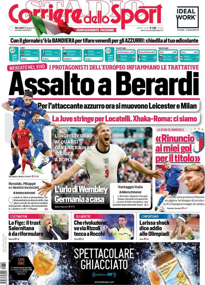 Nell'edizione odierna, il Corriere dello Sport, apre in prima pagina con le trattative di mercato dei protagonisti degli Europei: "Assalto a Berardi. Per l'attaccante azzurro ora si muovo Leicester e Milan. La Juve stringe per Locatelli. Xhaka-Roma: ci siamo". A centro pagina il risultato dei ultimi due ottavi di finale di Euro 2020: "L'urlo di Wembley: Germania a casa. L'Inghilterra ai quarti con l'Ucraina, si gioca a Roma". In taglio basso in evidenza la nomina del nuovo designatore arbitrale: "Che rivoluzione: va via Rizzoli, tocca a Rocchi".