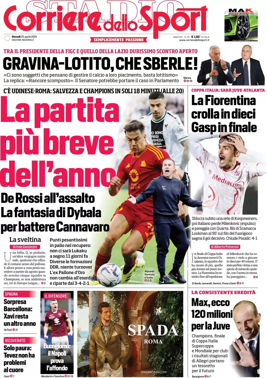 Nell'edizione di oggi, il Corriere dello Sport dedica l'apertura in prima pagina a Udinese-Roma, che riprende stasera: "La partita più breve dell'anno". In taglio basso spazio al mercato del Napoli: "Buongiorno: il Napoli prova l'affondo". In taglio alto il botta e risposta tra Gravina e Lotito: "Gravina-Lotto, che sberle!". Di spalla spazio alla semifinale di Coppa Italia vinta ieri dall'Atalanta: "La Fiorentina crolla in dieci: Gasp in finale".