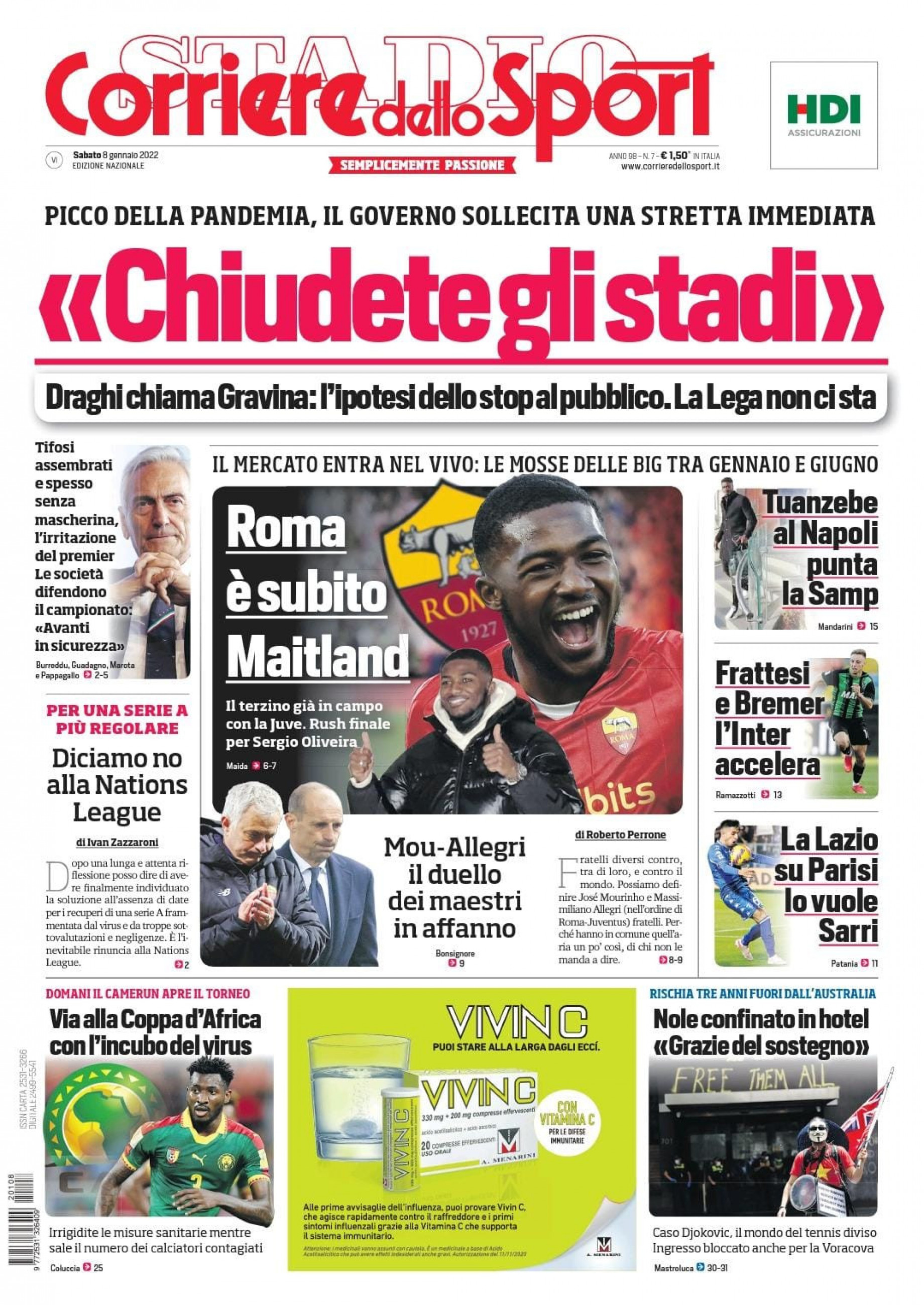 "Chiudete gli stadi", si legge in prima pagina sull'edizione odierna del Corriere dello Sport con riferimento al Premier Draghi che ha parlato a Gravina di uno stop al pubblico, ma la Lega non ci sta. Di spalla c'è Tuanzebe, nuovo acquisto del Napoli, che punta la Sampdoria.