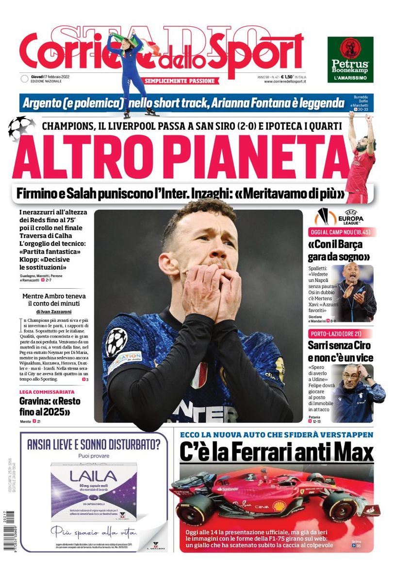 Nell'edizione di oggi il Corriere dello Sport riporta le parole di Luciano Spalletti della conferenza di presentazione di Barcellona-Napoli: "Con il Barça gara da sogno. Vedrete un Napoli senza paura". Per la sfida del Camp Nou è in forse il centravanti azzurro: "Osi in dubbio, c'é Mertens". Apertura dedicata alla sconfitta casalinga dell'Inter in Champions contro il Liverpool: "Altro pianeta". Di spalla spazio alla Lazio, impegnata oggi in Europa League: "Sarri senza Ciro e non c'é un vice".
