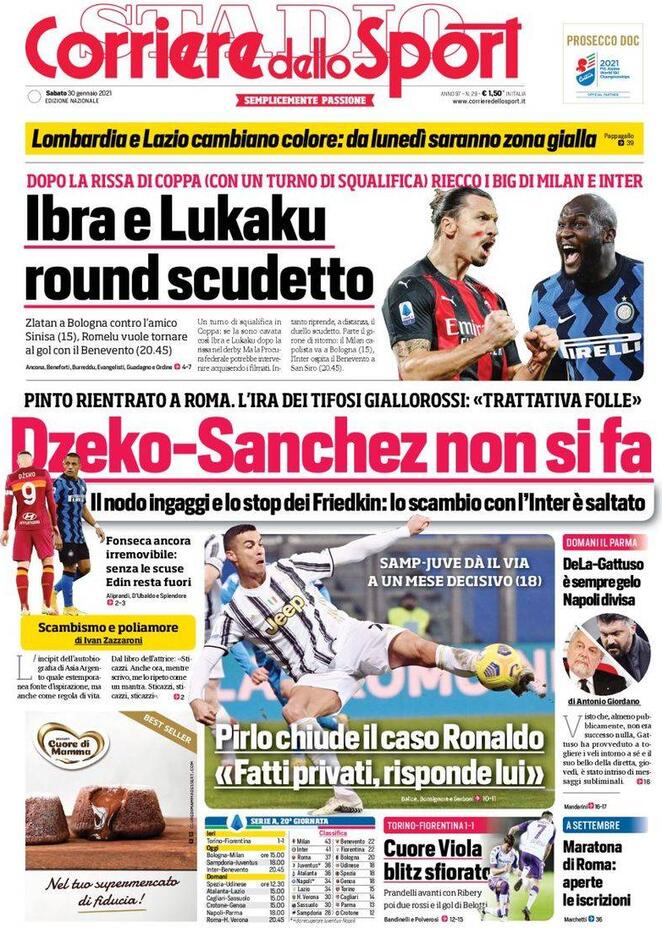 "Dzeko-Sanchez non si fa" scrive il Corriere dello Sport in apertura quest'oggi. Spazio al calciomercato e all'idea di mercato tra Inter e Roma che non andrà in porto. Il nodo ingaggi e lo stop dei Friedkin: lo scambio tra giallorossi e nerazzurri è saltato. Pinto è rientrato a Roma. L'ira dei tifosi romanisti: trattativa folle. Fonseca intanto è irremovibile: senza le scuse Edin resta ancora fuori!