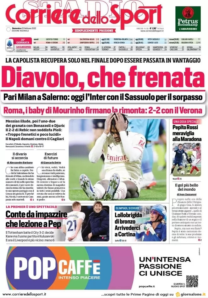 Nell'edizione di oggi, il Corriere dello Sport apre in prima pagina con il pareggio del Milan con la Salernitana: "DIavolo, che frenata. Pari Milan a Salerno: oggi l'Inter co Sassuolo per il sorpasso". A centro pagina l'altro pari di ieri, quello casalingo della Roma con il Verona: "Roma, i baby di Mourinho firmano la rimonta: 2-2 con il Verona". In taglio basso spazio alla vittoria per 3-2 del Tottenham di Conte sul City di Guardiola: "Conte da impazzire, che lezione a Pep".