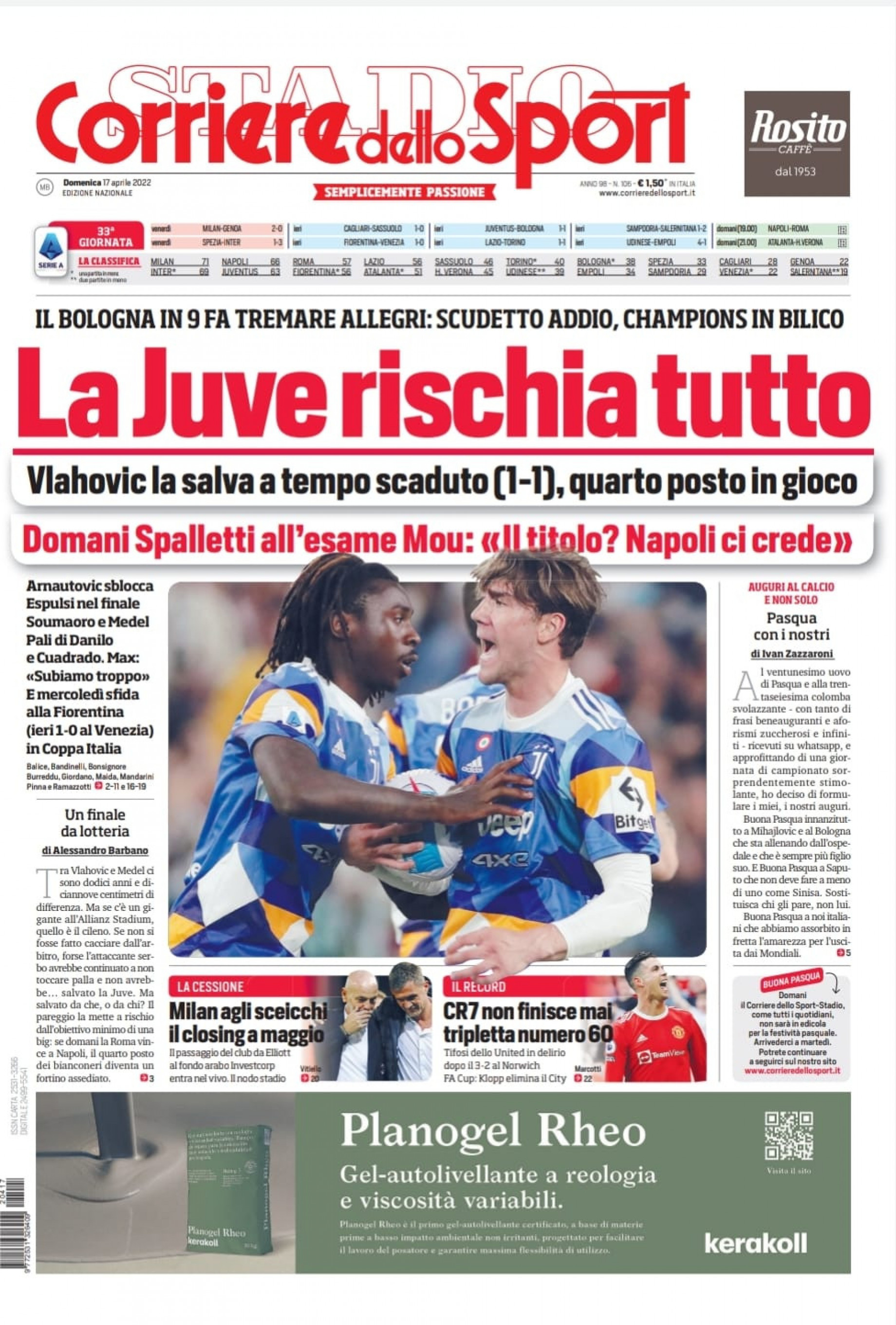 "Domani Spalletti all'esame Mou: 'Il titolo? Napoli ci crede'", titola così il Corriere dello Sport in prima pagina nell'edizione di oggi. Apertura dedicata al deludente pari intero della Juve contro un Bologna in 9 uomini: "La Juve rischia tutto. Vlahovic la salva a tempo scaduto (1-1), quarto posto in gioco". In taglio basso spazio alla futura vendita del Milan: "Milan agli sceicchi: il closing a maggio".