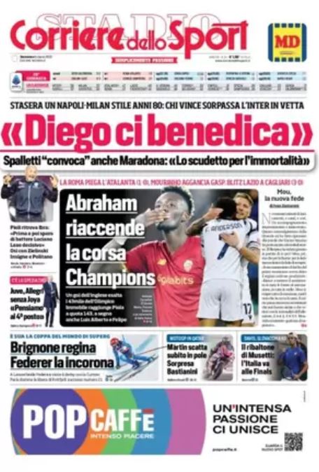 "Diego ci benedica" si legge sul Corriere dello Sport oggi in edicola con riferimento alle parole pronunciate in conferenza stampa da Luciano Spalletti in vista della sfida scudetto contro il Milan. "Stasera un Napoli-Milan stile anni '80" è un'altra frase del quotidiano.