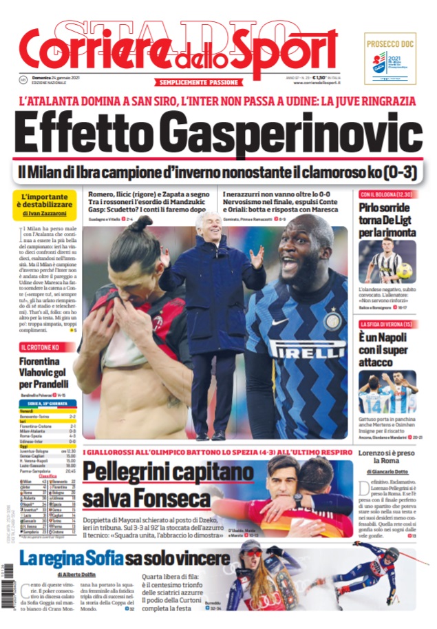 "E' un Napoli con il super attacco". Titola così in prima pagina il Corriere dello Sport nell'edizione di oggi. Nel Napoli per la trasferta di oggi al Bentegodi contro il Verona figurano tra i convocati, dopo due mesi e mezzo, entrambi gli attaccanti titolari: "Gattuso porta in panchina anche Mertens e Osimhen". Titolo in alto dedicato alla vittoria dell'Atalanta di Gasperini e Ilicic a San Siro contro il Milan: "Effetto Gasperinovic".