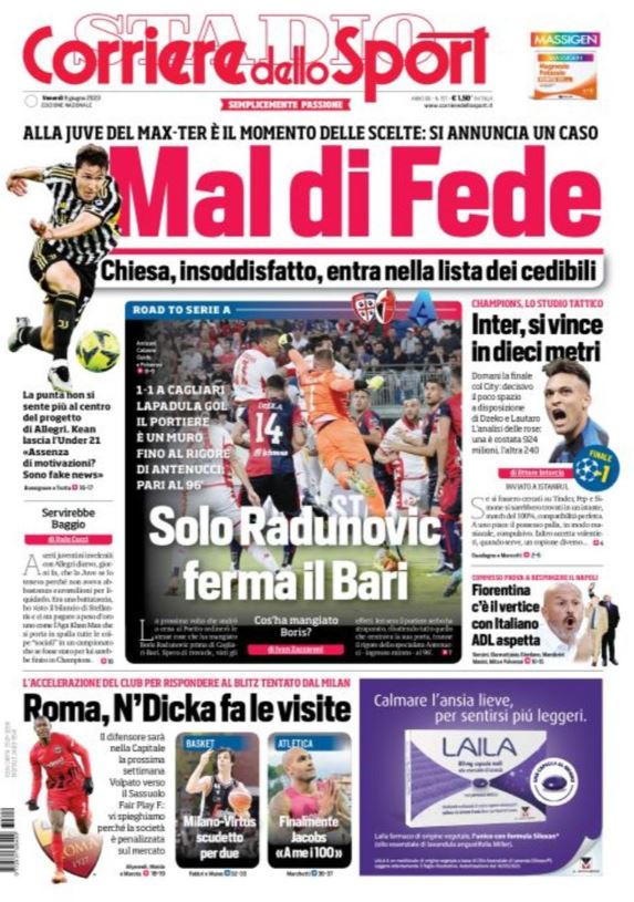 Il Corriere dello Sport dedica spazio alla questione legata al futuro di Vincenzo Italiano, tra i principali candidati al dopo Spalletti in casa Napoli. "Fiorentina, c'è il vertice con Italiano. ADL aspetta", titola il quotidiano. In primo piano: "Mal di Fede: Chiesa, insoddisfatto, entra nella lista dei cedibili" della Juventus, "si annuncia un caso".
