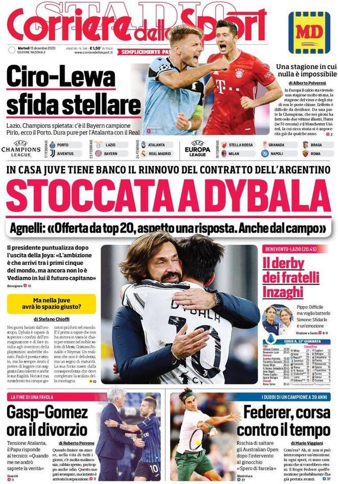L'edizione di oggi de Il Corriere dello Sport apre in prima pagina dando spazio ai sorteggi di Champions League ed Europa League, e quello che sarà il percorso delle italiane impegnate in Europa. Spazio anche alla situazione tesa in casa Atalanta, con il divorzio che pare ormai inevitabile tra Gasperini ed il Papu Gomez.