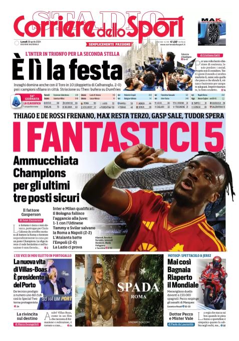 "I Fantastici 5", titola quest'oggi Il Corriere dello Sport parlando dell'accesissima corsa alla qualificazione in Champions League, con ben 5 squadre coinvolte per tre posti, a sole quattro giornate dal termine del campionato. Il sommario: "Thiago e De Rossi frenano, Max resta terzo, Gasp sale, Tudor spera". In taglio alto, spazio ai festeggiamenti dell'Inter per la conquista del ventesimo scudetto: "È lì la festa". Il commento: "Inzaghi domina anche con il Toro in 10 (doppietta di Calhanoglu, 2-0), poi i campioni sfilano in città. Striscione su Theo: bufera su Dumfries".