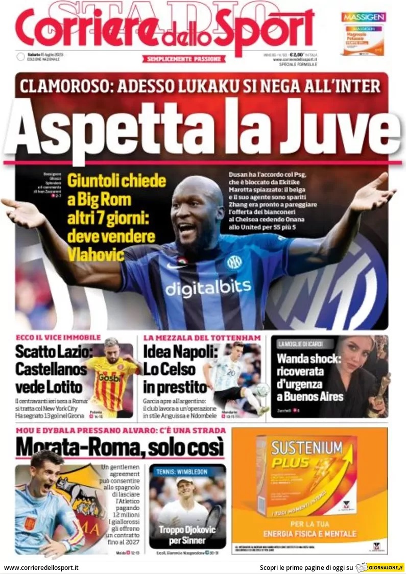 Nell'edizione odierna, il Corriere dello Sport apre in prima pagina con il caso Lukaku: "Aspetta la Juve. Clamoroso adesso Lukaku si nega all'Inter". A centro pagina spazio al mercato del Napoli: "Idea Napoli: Lo Celso in prestito. Garcia apre all'argentino: il club lavora ad un'operazione in stile Anguissa e Ndombele". Ancora mercato in taglio basso: "Morata-Roma, solo così".