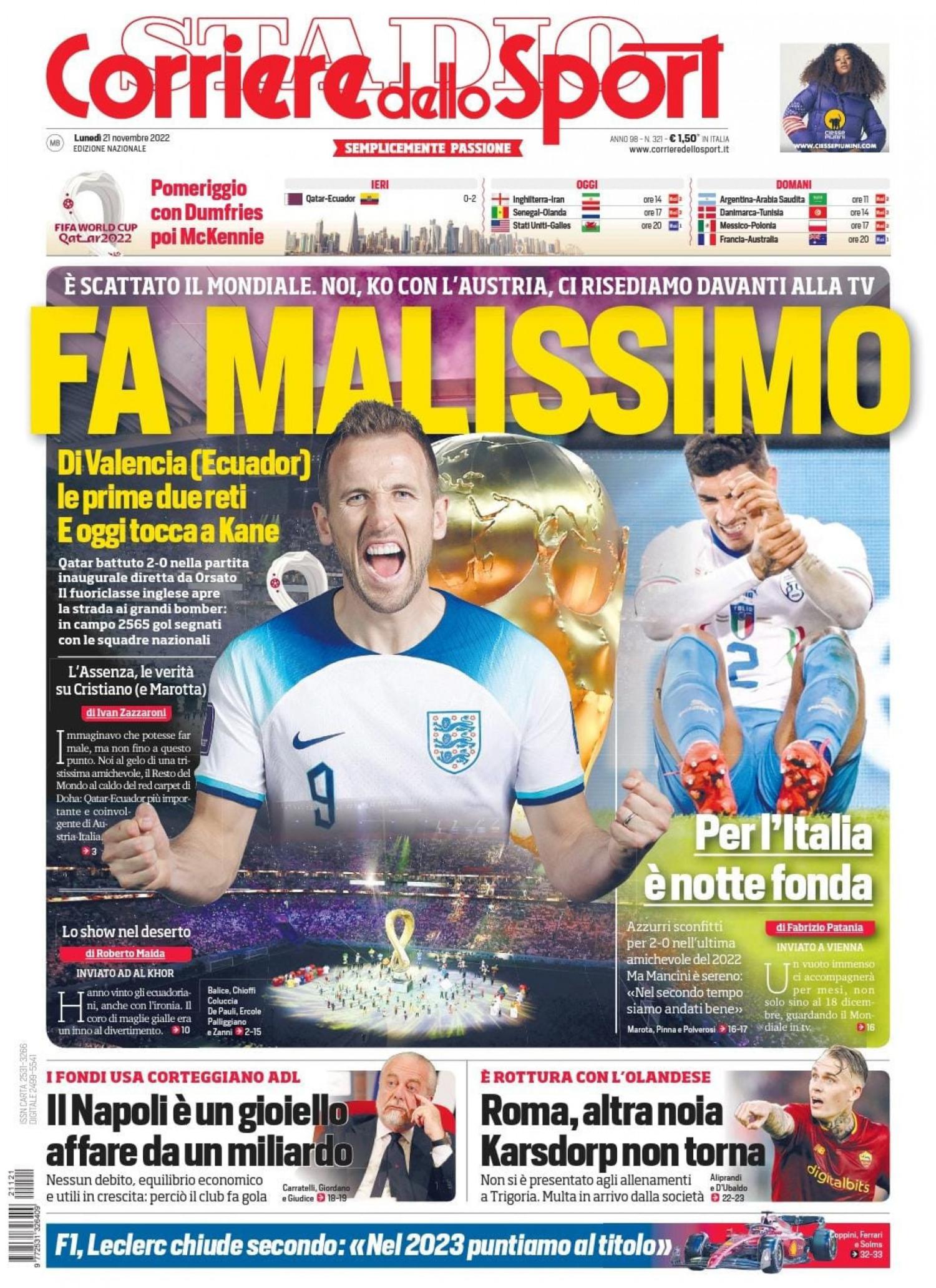 "Il Napoli è un gioiello, affare da un miliardo", titola così in prima pagina il Corriere dello Sport nell'edizione di oggi. "I fondi USA corteggiano ADL. Nessun debito, equilibrio economico e utili in crescita: perciò il club fa gola". In apertura spazio all'avvio dei Mondiali in Qatar mentre l'Italia perde in Austria in amichevole: "Fa malissimo. Per l'Italia è notte fonda. Azzurri sconfitti per 2-0 nell'ultima amichevole del 2022. Ma Mancini è sereno: 'Nel secondo tempo siamo andati bene'".