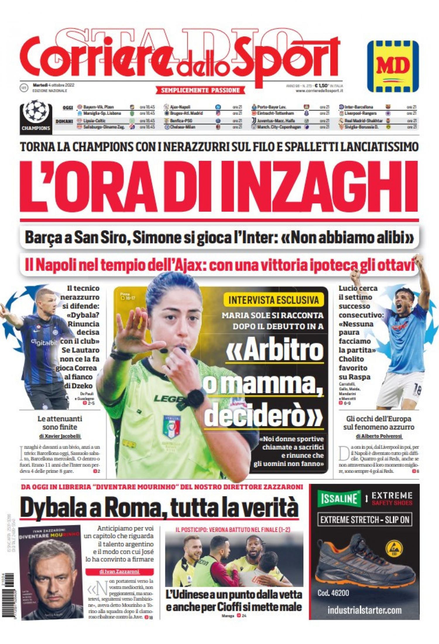 ”Il Napoli nel tempio dell'Ajax: con una vittoria ipoteca gli ottavi", titola così in prima pagina il Corriere dello Sport nell'edizione di oggi. "Lucio cerca il settimo successo consecutivo: 'Nessuna paura, facciamo la partita'. Cholito favorito su Raspa". In apertura la sfida tra Inter e Barcellona, con il tecnico nerazzurro in bilico: "L'ora di Inzaghi". A centro pagina l'intervista all'arbitro Maria Sole Ferrieri Caputi: "Arbitro o mamma, decidero".