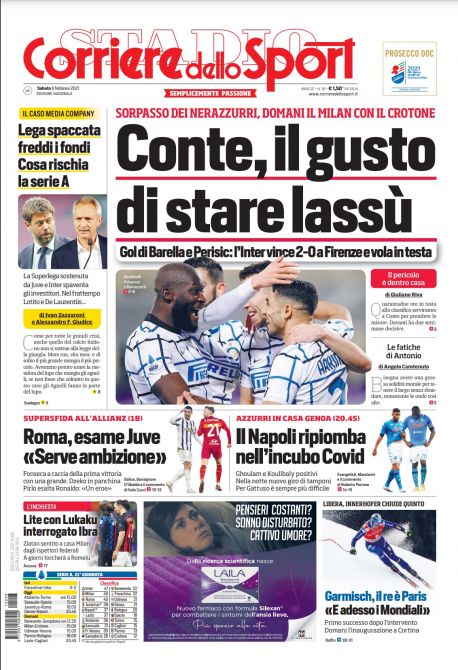 Il Corriere dello Sport apre in prima pagina con la notizia della positività al Covid di Ghoulam e Koulibaly: “Il Napoli ripiomba nell’incubo Covid”. Al centro spazio al successo dell'Inter nell'anticipo contro la Fiorentina: "Conte, il gusto di stare lassù. Gol di Barella e Perisic. l'Inter vince 2-0 a Firenze e vola in testa". Sulla sinistra si parla dei fondi per la Lega di Serie A: "Lega spaccata, freddi i fondi".