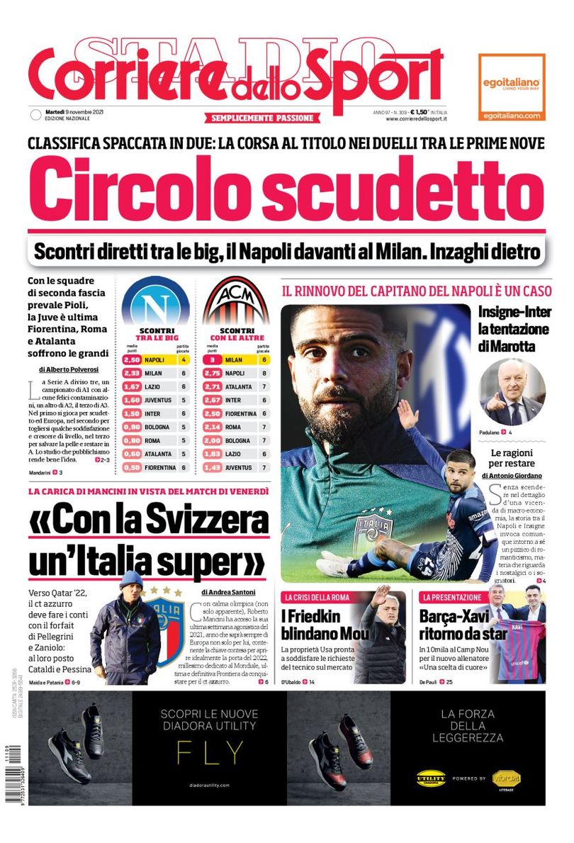 Il Corriere dello Sport apre in prima pagina con il futuro di Lorenzo Insigne e la lotta scudetto in Serie A: "Il rinnovo del capitano del Napoli è un caso. Insigne-Inter: la tentazione di Marotta". "Circolo scudetto. Classifica spaccata in due: la corsa al titolo nei duelli tra le prime nove. Scontri diretti tra e big, il Napoli davanti al Milan. Inzaghi dietro. Con le squadre di seconda fascia prevale Pioli, la Juve è ultima. Fiorentina, Roma e Atalanta soffrono le grandi". In basso la Nazionale e le parole di Roberto Mancini, la situazione in casa Roma e il ritorno al Barcellona di Xavi.